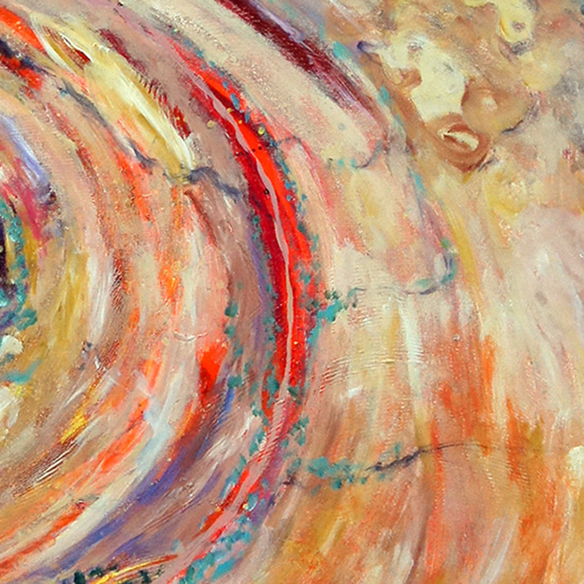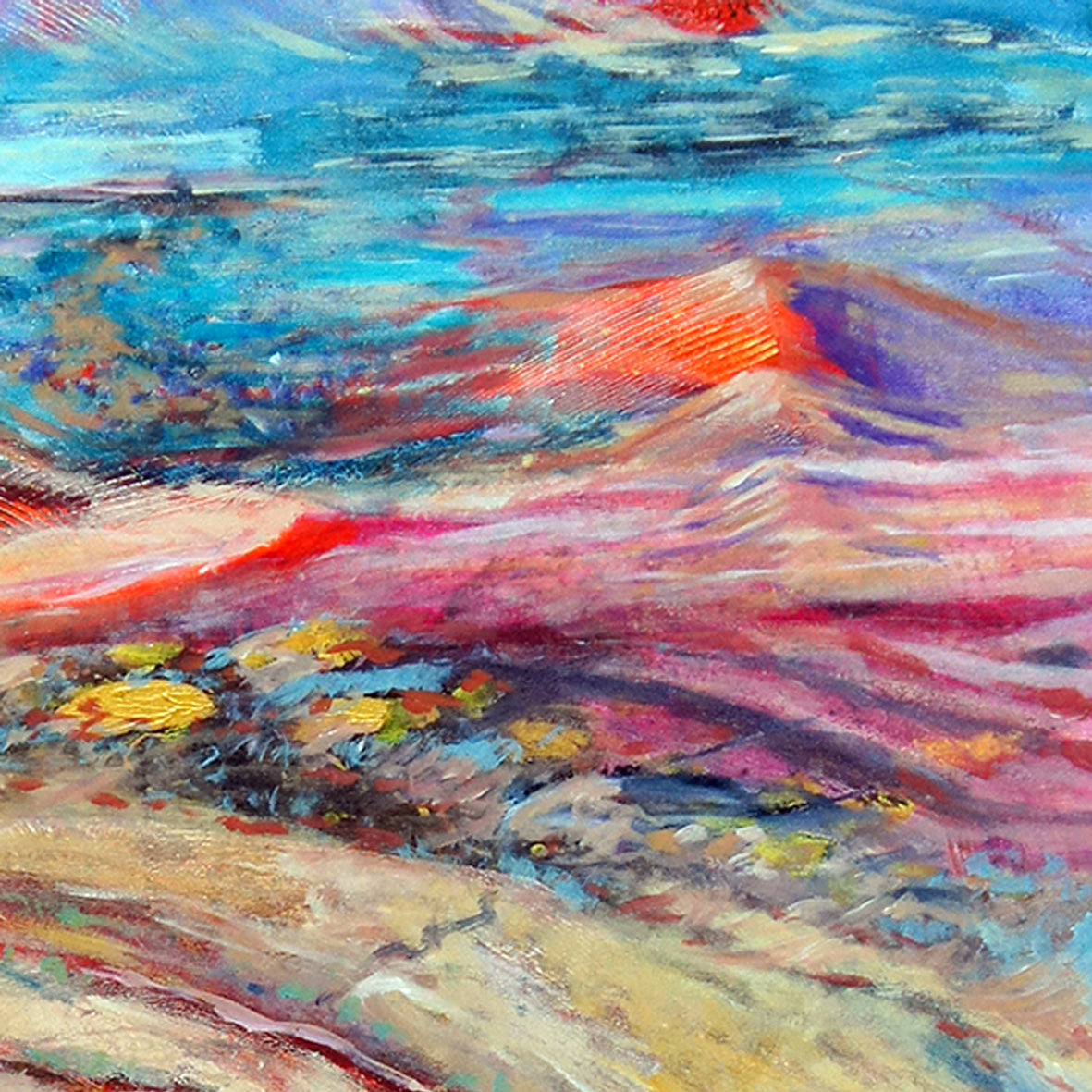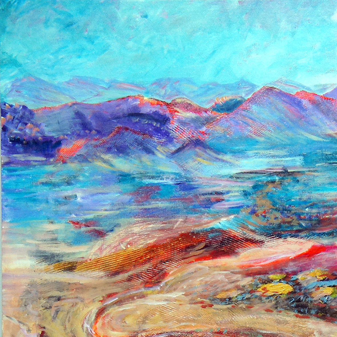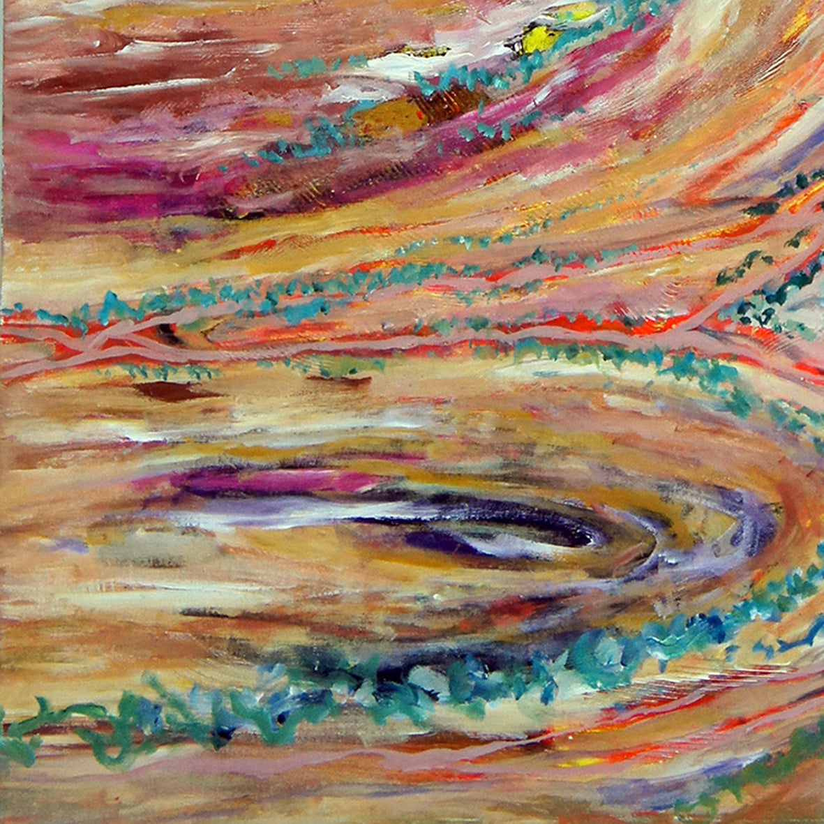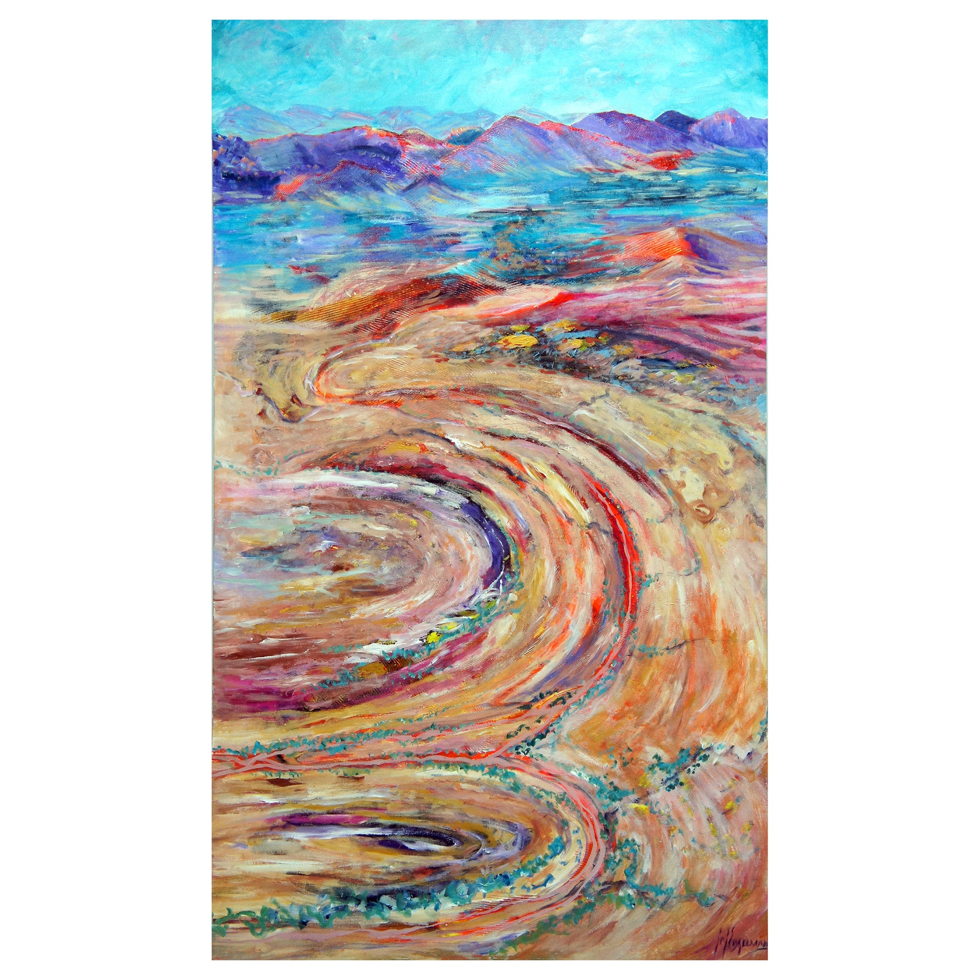 In this painting, the headwaters of the floodplain flow out from the ancient Arkaroola hills and overtime water has shaped this land into a large curvaceous place. Occasional rain fills the few waterholes and dry creek beds. It seeps in to sandy areas where small shrubs and hardy eucalypts can grow.